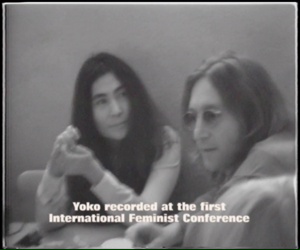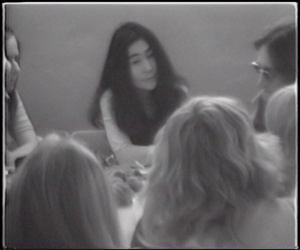 Notes: Black & white home movie of John & Yoko chatting with a group of women in the cafeteria at Lesley College where they also did some interviews on this day.